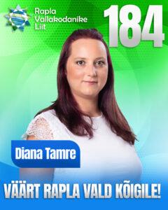 Minu nimi on Diana Tamre, olen 34-aastane ja kandideerin esmakordselt Rapla valla kohaliku omavalitsuse volikogu valimistel.